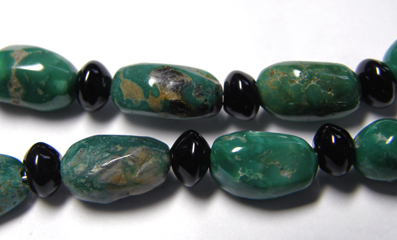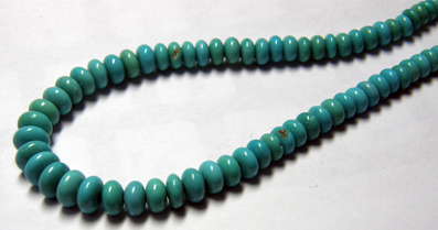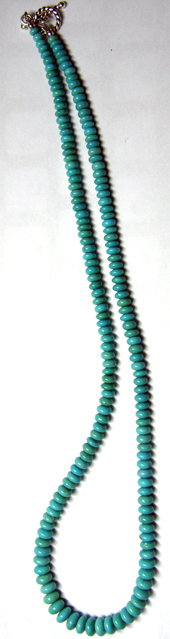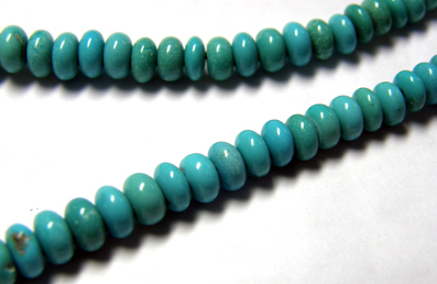 大半のビーズネックレスはスタビライズド・ターコイズを使っています。特に削り込んだヘイシビーズの場合、ナチュラルですと割れたり欠けたりしやすいため、普通のものは100%スタビライズ(樹脂加工)されてます。また、ナゲット(小石状)ビーズでも、大半は質のそれほど良くないターコイズを使うのと、やはり割れやすいのでスタビライズされているものが99%と言えるでしょう。