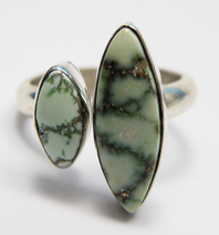 ナバホのRonnie Willieのナチュラル・カリコレイク・ターコイズの、2連リング。若草のようなカラーです。真ん中が開いているのでサイズを少し広げることも可能。アーチストのフルネームとSTERLINGの刻印あり。