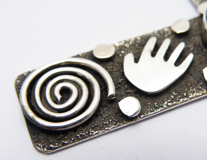 ナバホのアレックス・サンチェス制作のナチュラル・パイロットマウンテン・ターコイズのトゥーファーキャスト・ペンダント。彼はアメリカのフォーコーナーズの先住民の遺跡の壁画にインスピレーションを得たという、星、動物、天体、などのシンボルを暗い色のテクスチャーの上に重ねるデザインが特徴です。バチカン径が12ミリと非常に大きく、ボールチェーンやビーズも楽勝で通ります。バチカンのぞいた全体サイズは65×45ミリ。濃いグリーンのターコイズはトゥーファーキャストの肌にも良く合い、20×14ミリ。アーチストのフルネームとsterlingの刻印があります