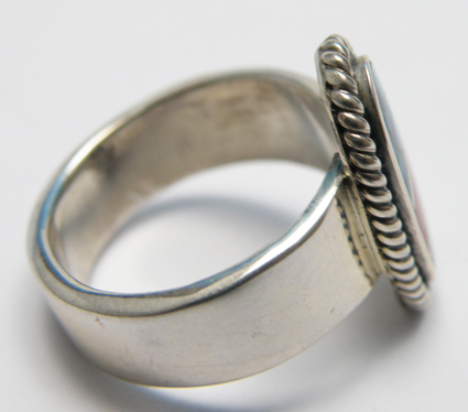 Koyukiのカスタムオーダーを一手に引き受け、ナバホ居留地でジュエリーのスクールの講師もしているThomas Carusettaさんの、スパイダーウェブ入りチャイニーズ・ターコイズとサンゴのソリッドインレイリング。ピンキーサイズ。しきりに銀線が入ります。石のサイズ14×6ミリ。アーチストのフルネームとSTERLINGの刻印入り。拡大写真はこちらでご覧になれます。