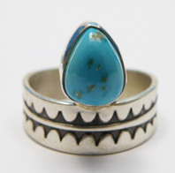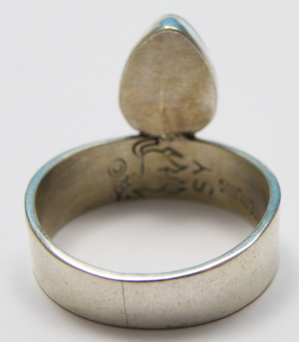 Steve Yellowhorseの、ナチュラル・カンデラリア・ターコイズのリング。非常に綺麗な彫刻が施され、石のサイズ10×7ミリ。アーチストのトレードマークとイニシャルとSterlingの刻印入り。