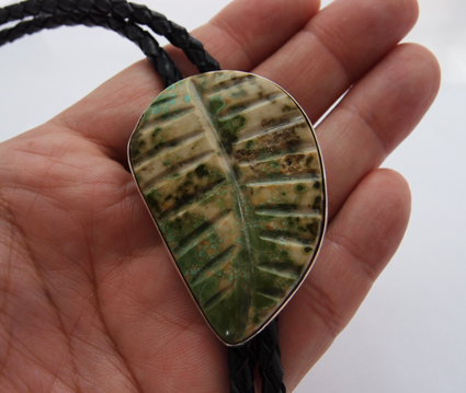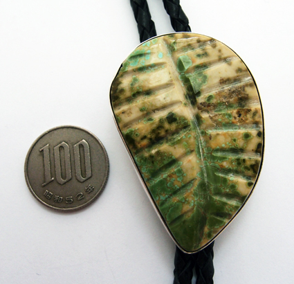 黄色いシャツや茶色のジャケットに似合いそうな、スタビライズド・キングマンの大きなボロタイです。ターコイズは多孔質でこういう表面を削ったりするときにはスタビライズして樹脂加工してない石だと割れたり欠けたりします。シンプルですがサイズは52.5×36ミリもあって、しかも色がまさに葉っぱなのでめちゃくちゃ目を引くと思います。アーチストのイニシャルとstelingの刻印入り。